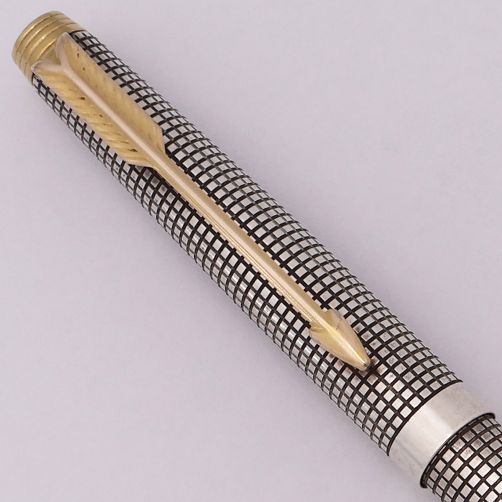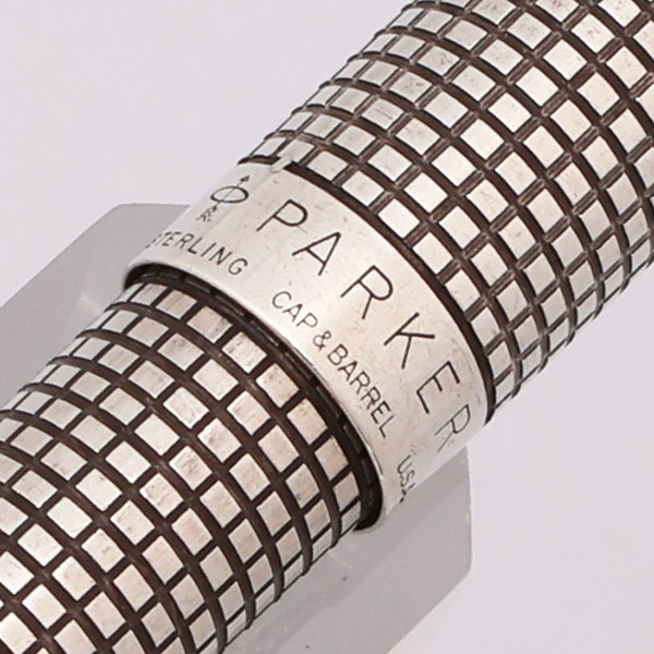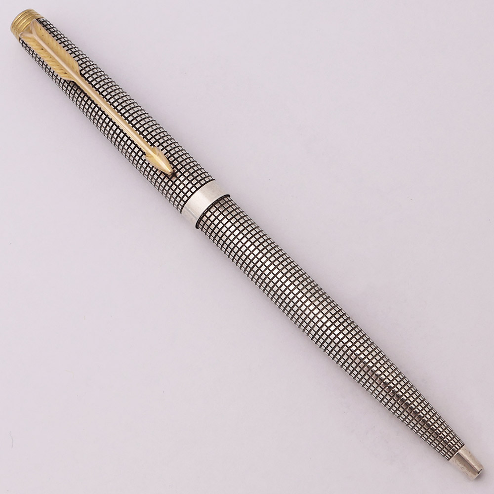 Condition Excellent condition with no cracks or dents. This is a shiny, classic ballpoint pen in the sterling silver "Cisele" pattern. All the little squares are intact and outlined in black, though there is some surface scratching. The cone and cap band have microscratching. The clip has a bit of plating wear along the sides, and brassing on the spine and around the arrow. The top edge of the tassie has brassing. The imprints and hallmarks are clear.