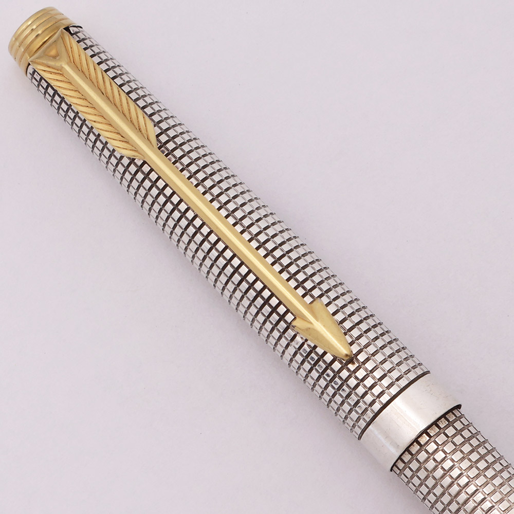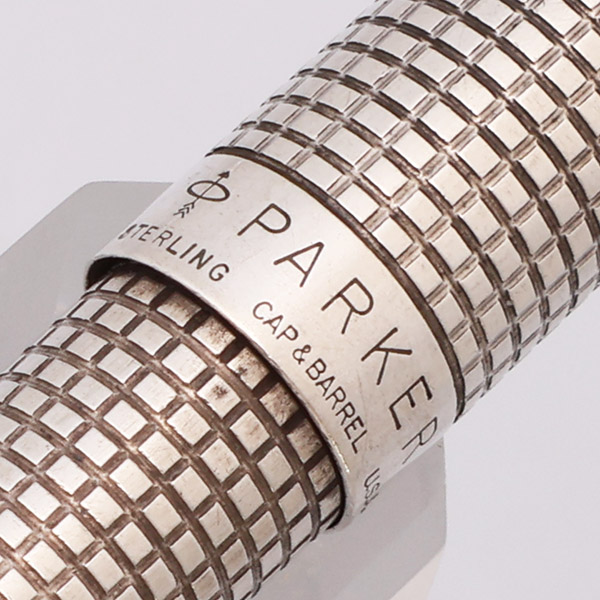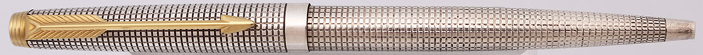 Condition Excellent condition with no cracks or dents. This is a shiny, classic ballpoint pen in the sterling silver "cisele" pattern. All the little squares are intact and outlined in black, though there is some surface scratching. There is plating wear on the clicker where it meets the cap. The cone and cap band have microscratching. The clip has some plating wear along the arrow edges and inside the feathers. The imprints and hallmarks are clear.