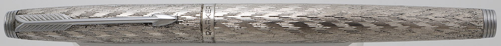 Condition Very nice condition with no cracks, chips, dents, or dings. This is a very shiny, shimmery pen with a pattern of stair-step short lines. The top and bottom have stepped tassies. The cap and barrel have moderate to heavy microscratching and quite a bit of small pits that can be seen in the photos. The cap band has moderate microscratching. The arrow clip looks nice. The tassies have light microscratching. The imprints are all clear.