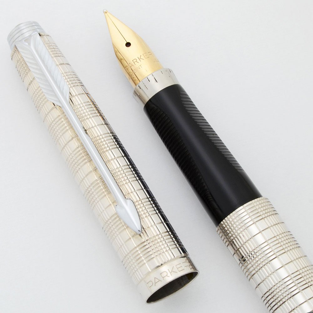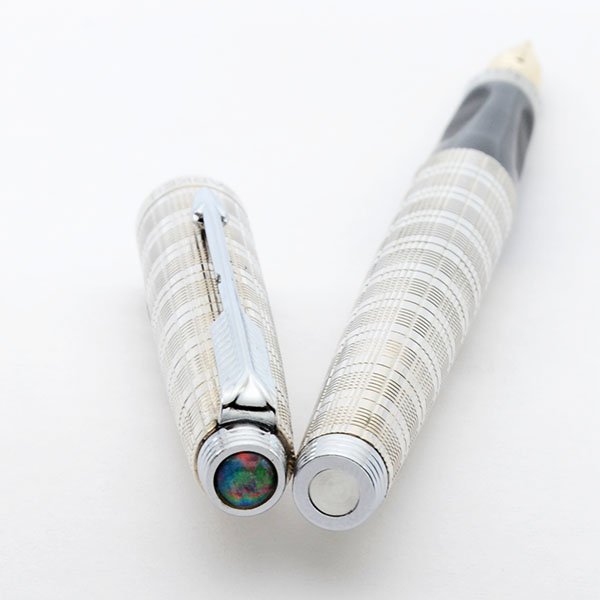 Color Silver plated fine grid in a plaid pattern with silver plated trim and dish tassies. The top of the cap has a beautiful , colorful, opalescent rounded jewel. We have seen those on later Parker 75 "Custom" pens.