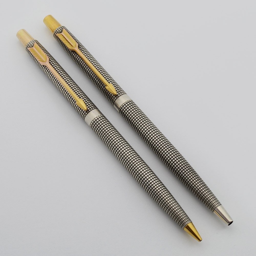 Condition Near Mint condition. The trim and imprints are great and the grid patterns are firmly delineated. No dents or personalization. There's some handwear on the gold trim on both. The ballpoint pen has a few marks of plating wear on the derby. The plating looks a bit thin on the pencil plating on the derby. They work very well.