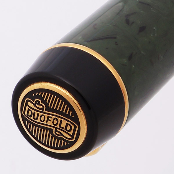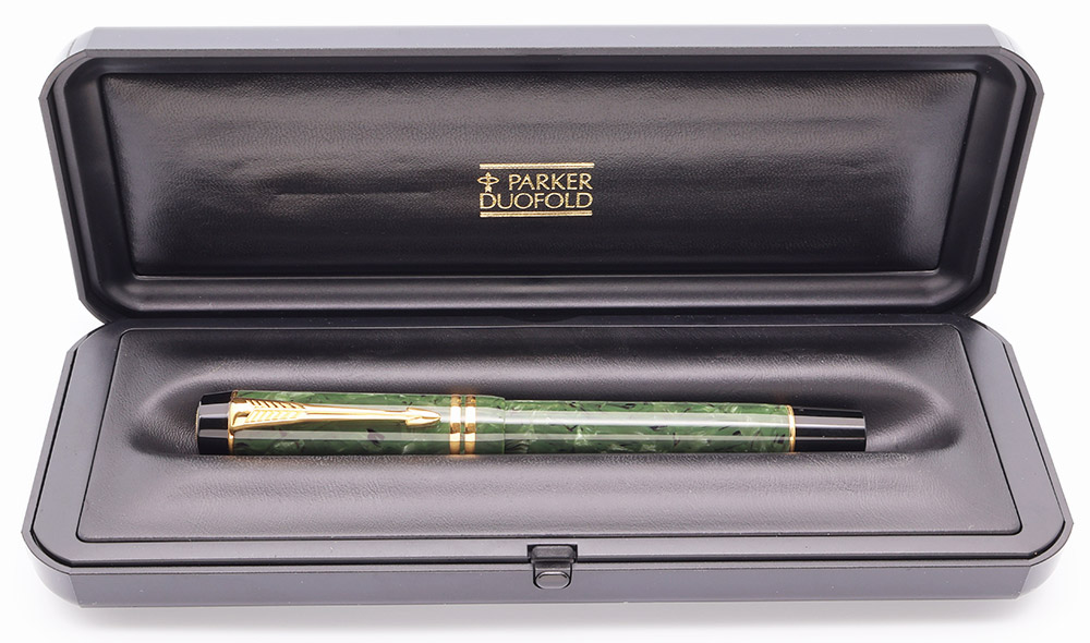 Condition Excellent + condition. The cap has light to moderate scratching. The barrel has light scratching. There is microscratching and polishing marks on the trim, but no corrosion on the nib collar. The cap emblem looks good. Ships in original Duofold Centennial box with outer cardboard box. The imprints are clear.