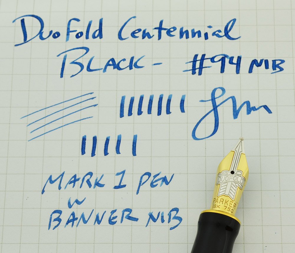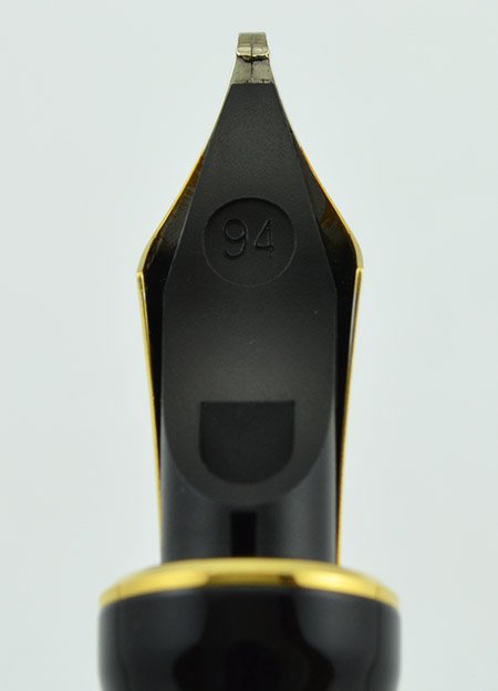 Nib ITALIC18k 750 nib is marked 94 on the feed. The 94 indicates medium factory italic. It will write like a medium-broad. This is the "banner" style nib which goes with the mark 2 Duofold, correct for the section but not the barrel and cap. See the writing sample below.