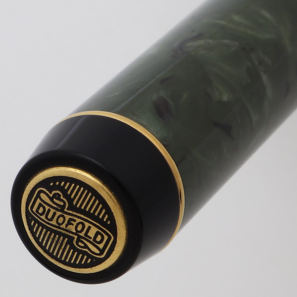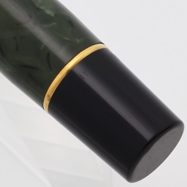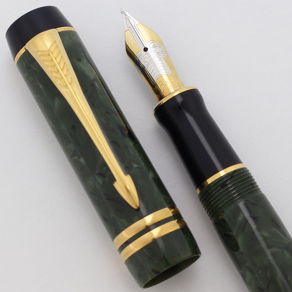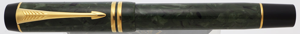 Condition Excellent condition with no cracks, chips, dents, or dings. This is a shiny, dark green jade fountain pen that has classic Parker Duofold styling. The cap and barrel have light to moderate wear. The double cap band has moderate microscratching. The clip and clip ring have light to moderate microscratching. The imprints are clear.