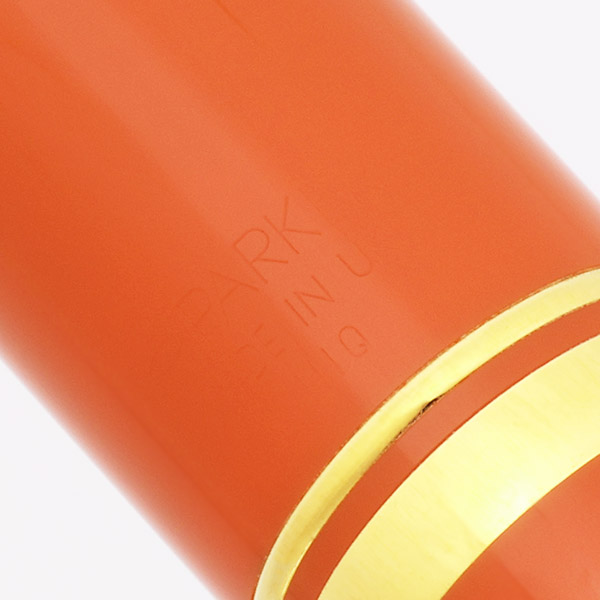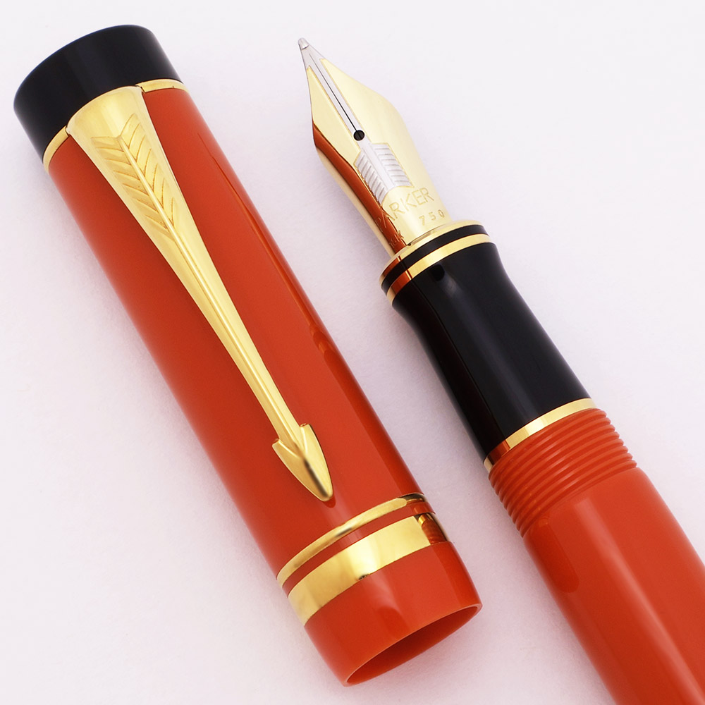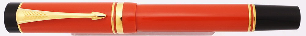 Color Solid orange with black end pieces and gold plated trim. The orange is very similar to the older red hard rubber or the permanite that Parker used decades earlier.