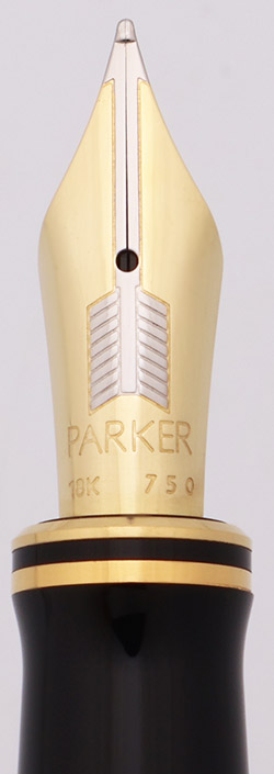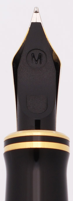 Nib Medium 18k nib. It is marked M on the feed. It writes smoothly and has an arrow on the face.