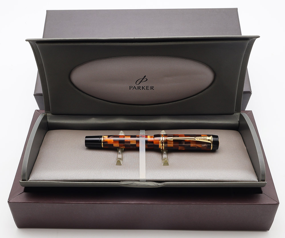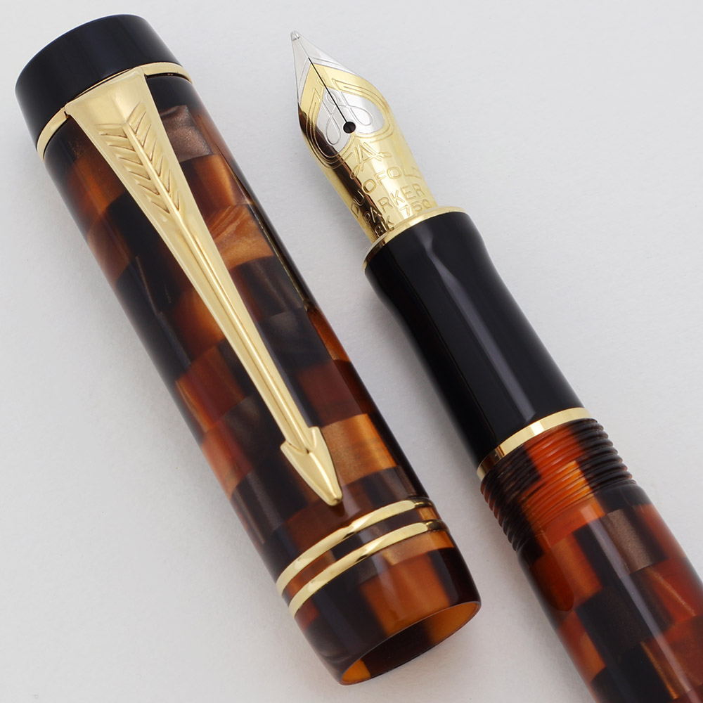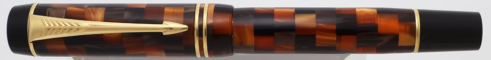 Color "Check Amber" - a lovely mosaic of oranges and browns. The barrel and cap end pieces, as well as the section, are black. Gold plated trim.