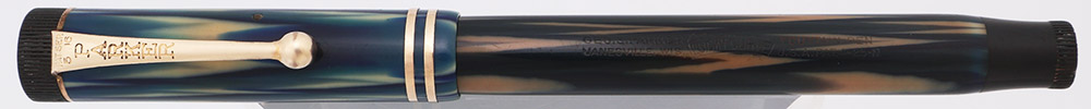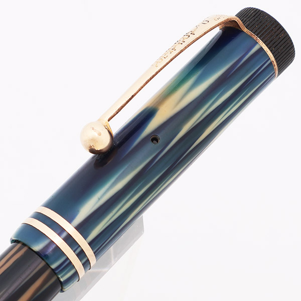 Condition Excellent condition with no cracks, chips, dings, or dents. This is a nice-sized pen in a unique color, and in a classic design. There is a distinct difference in the color of the barrel vs that of the cap, which is very common. The "white stripe" highlights on the barrel are medium brown. The cap color is quite nice, with a strong difference between the blue and white colors, and only minor ambering of the lighter color. The clip has plating wear along the sides, and some brassing around the ball end. The cap bands have some scratch marks but no brassing or plating wear. The knurling around the edge of the cap finial piece has some shallow tooth marks. The end of the barrel has marks caused by the cap lip. The imprints on the pen are clear.