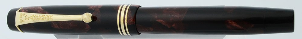 Color Burgundy and black marbled material. The cap has a black flat top piece and the blind cap is also black. It has a triple cap band. Gold filled trim