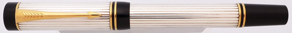 Condition Excellent + condition. Light handwear and polishing marks on both cap and barrel. There are some tiny dents in the silver near the top of the cap, just to the right of the clip. No dents or dings in the rest of the metal portions of the cap and barrel. No brassing or plating wear on the trim. Microscratching on the finials and section. In Parker box, correct for this version of the Duofold, but it might not be the same box this pen would have started with, and it's a little beat up.