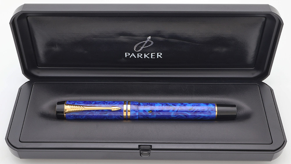 Condition Excellent + condition, in box. There are really only very light signs of use, mostly just some microscratching throughout. No brassing or plating wear on any of the trim, just microscratching and polishing marks. There are some light scratches on the barrel end piece, from posting the cap. Ships in Parker Duofold box with outer cardboard box.