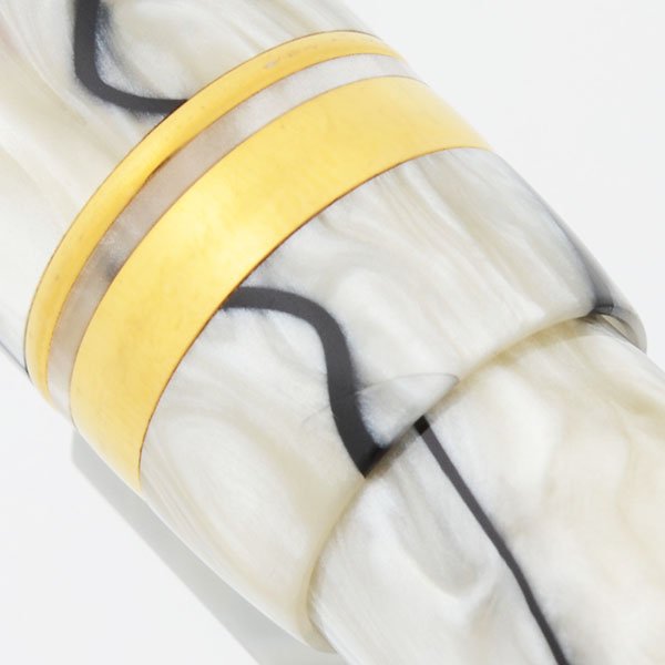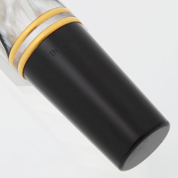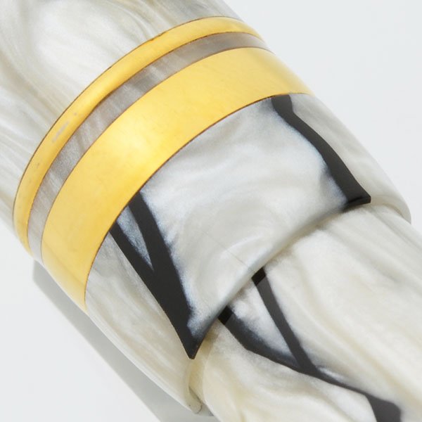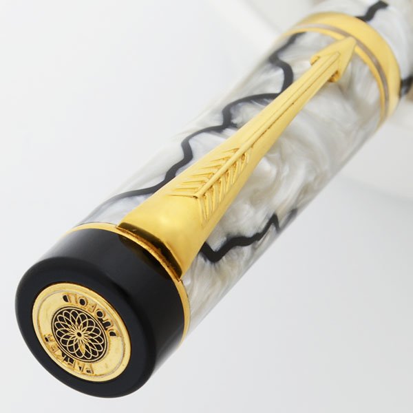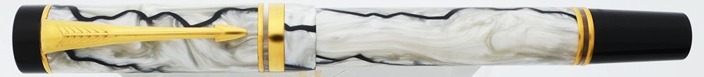 Color Black pearl (pearly white swirls with black squiggly lines). Gold plated trim and clip. Two cap bands (one 1/16" and one 1/8"). Black end pieces. Parker Duofold emblem on top of cap.