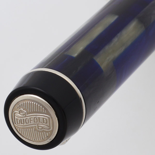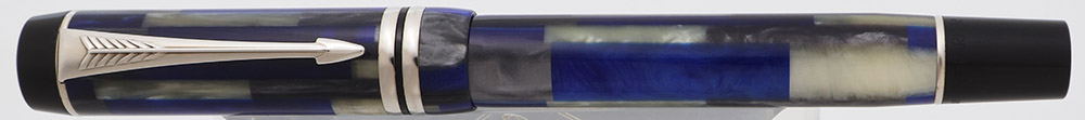 Condition Excellent + condition with no cracks, chips, dents, or dings. This is a beautifully colored, shiny pen, with a unique geometric pattern of blue, black, and white. The barrel has light marks caused by the cap lip and light scratching. The cap has light scratching and moderate microscratching. The double cap bands have microscratching in the center of the bands, particularly the lower band. The clip and clip ring have light microscratching. The Duofold disc on the top of the cap has some small scratches along the edge but the logo is crisp. The imprints are clear.