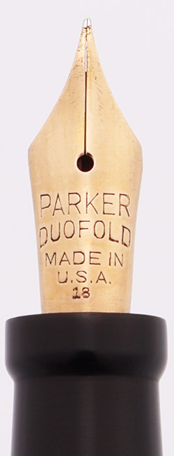 Nib FINE Parker Duofold nib, stamped with "Parker Duofold Made in USA 18". Smooth with excellent tipping material. (See note below regarding the stamping)
