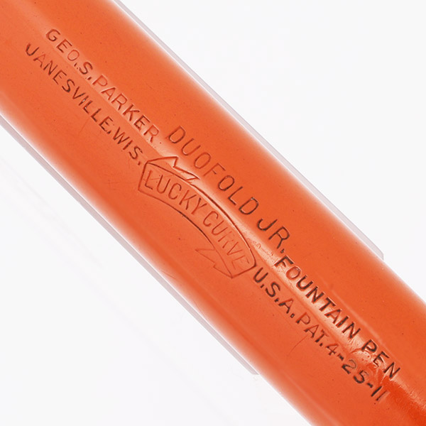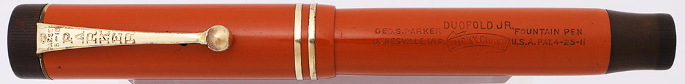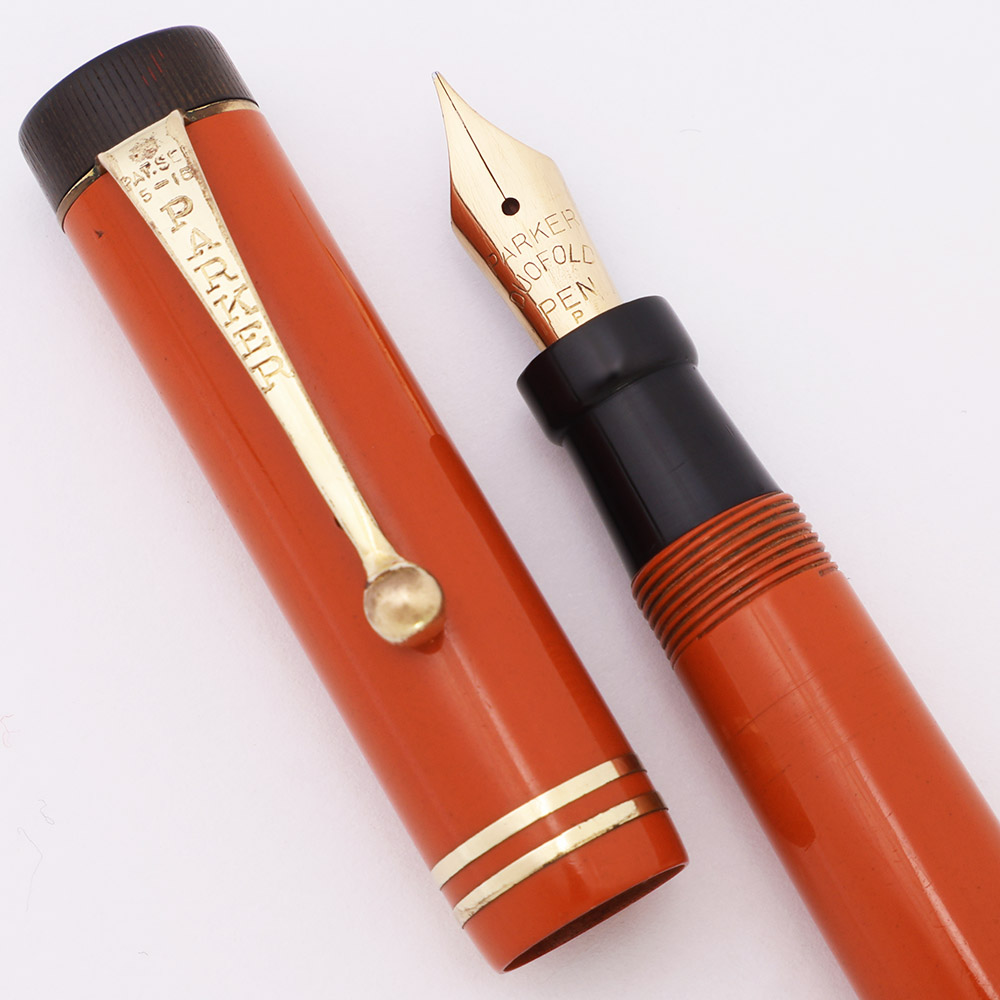 Color Red (orange) permanite with gold plated trim and black end pieces. The cap band is the pair of narrow bands introduced in the late 1920s.