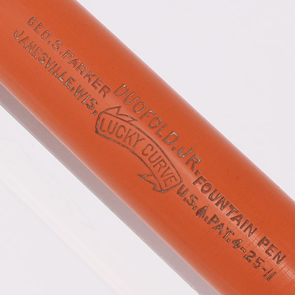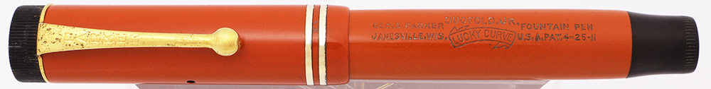 Color Red (orange) permanite with gold plated trim and black end pieces. The cap band is the pair of narrow bands introduced in the late 1920s.