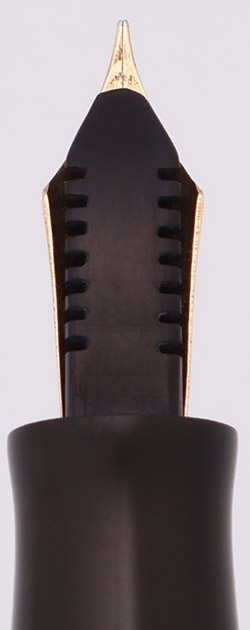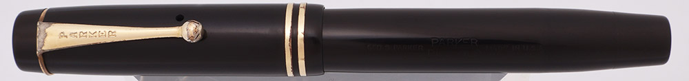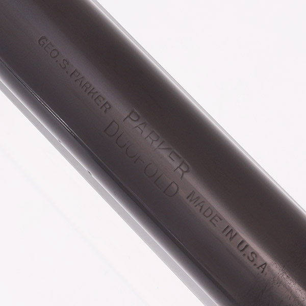 Condition Excxellent condition with no chips, dents, or dings. This is a velvety black, shiny pen that has a classic vintage appearance. The barrel has marks caused by the cap lip as well as from posting. It has light scratching other than in these two places. The cap has light to moderate scratching and the surface has small crackles. Both cap bands have some plating wear and small splotches of pitting. The clip has plating wear on the ball end as well as along the top edge. It has light microscratching all over. The clip ring has brassing and a thin line of pitting. The imprints are clear.