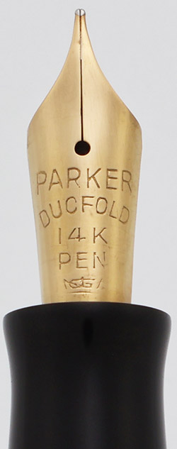 Nib MEDIUM-FINE 14k Parker Duofold nib is smooth and firm with great tipping material. There's a funny imprint at the base of the nib, we can't tell if it is an obscured date code.