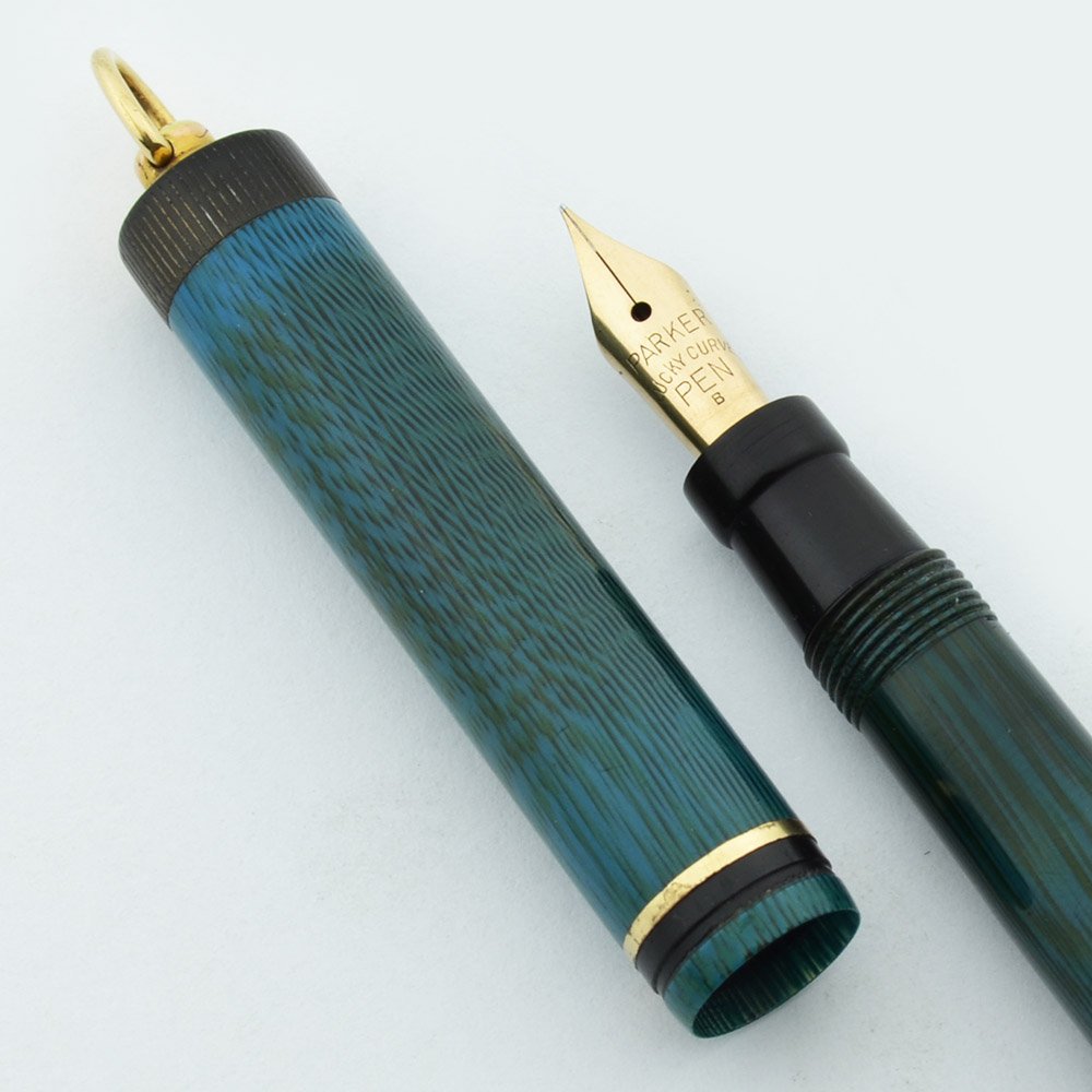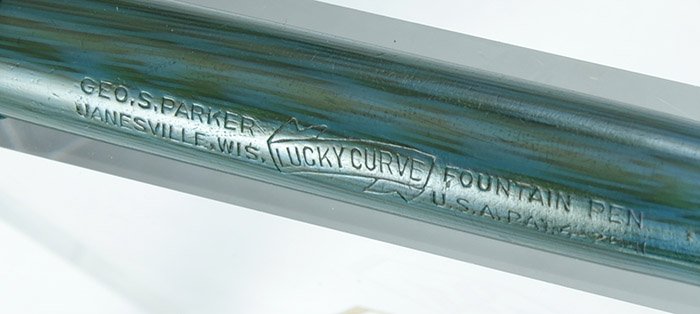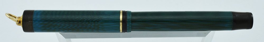 Color We think this is the Naples Blue Pastel color, which when you see it on the pencil is a rich teal blue. On this pen the "grain" of the celluloid has absorbed some of the ink and you'll see thin black and green lines. There's one thin cap band where there were once two, with a thin black band between.