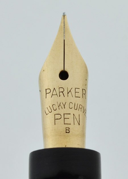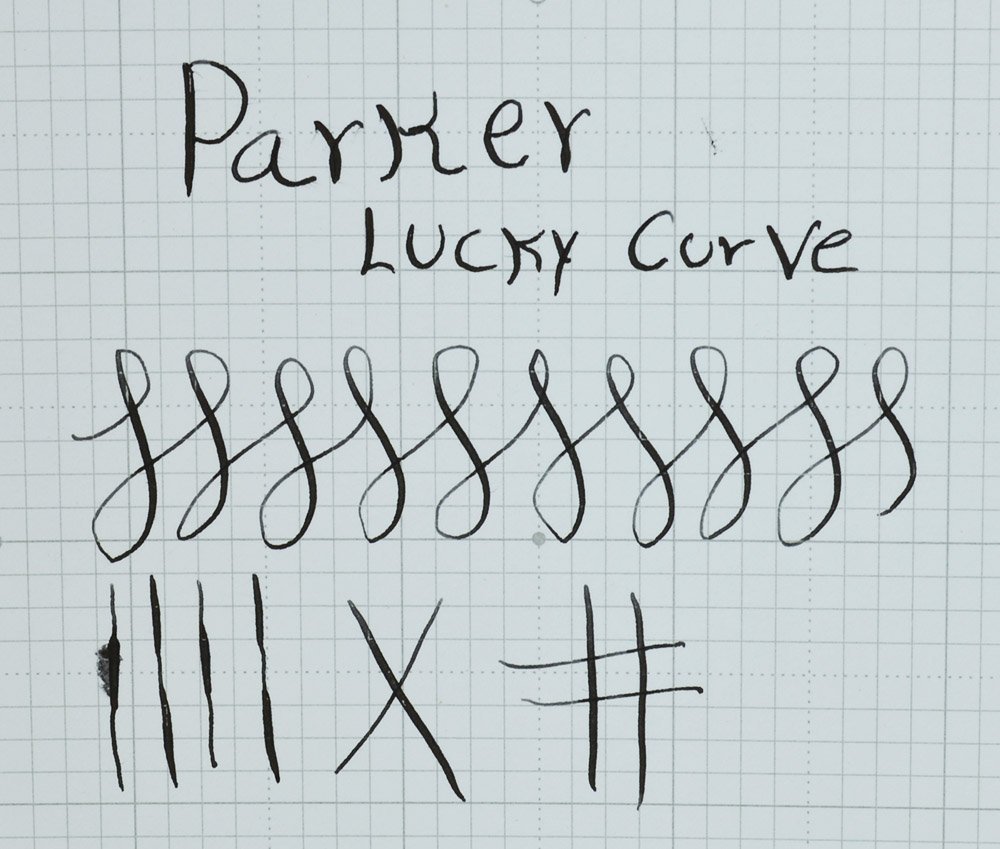 Nib FINE semi-flexible gold Lucky Curve nib marked B. It's smooth with nive tipping material. It has a bit of flex, with easy line variation from fine to a small broad, or a bit more with a little pressure. See our writing sample below.