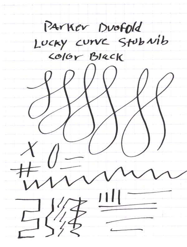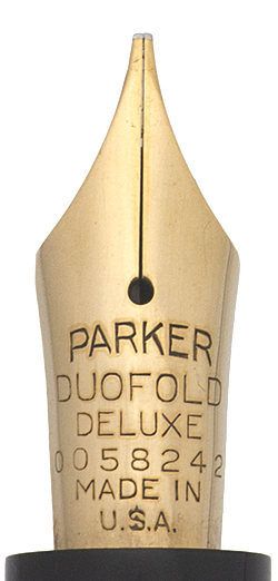 Nib STUB gold Parker nib, medium width. It is large and says Parker Duofold on it. The nib has serial number: 0058242. Please see writing sample.