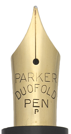 Nib MEDIUM Firm gold Parker nib. It is large and says Parker Duofold on it.