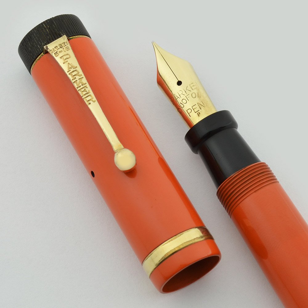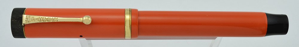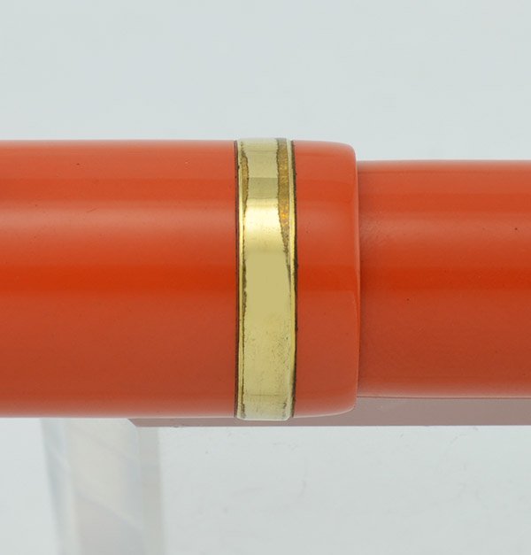 Color Red (orange) permanite with gold plated trim and black end pieces. The cap band is raised.