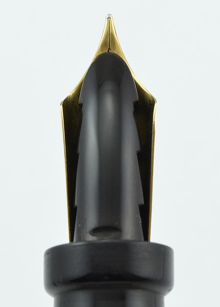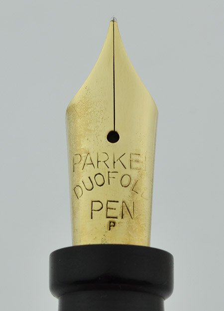 Nib Fine gold Parker Duofold nib. The nib is large and firm. It is labeled, "P." Part of its imprint is faded.