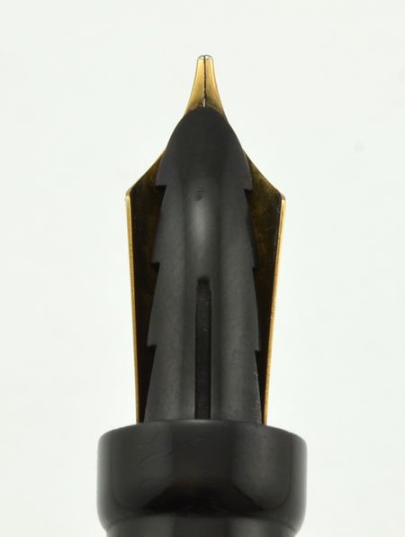 The permanite of the cap and body is in excellent condition with no cracks or chips. The trim is superior with no brassing except on the ball of the clip (excellent cap band) and some on the writing of the clip. The nib is massive! The condition is excellent, straight and smooth with plenty of iridium left. We took the pen apart to clean it and put in a new sac. The filling system works very well. We guarantee the pen completely, so if it doesn't meet your expectations, we encourage you to return it. |