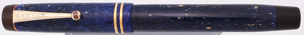 Color Lapis is deep blue and black marbled with white flecks permanite (celluloid) body and cap with gold filled trim. The top of the cap and end of the barrel are flat and black.