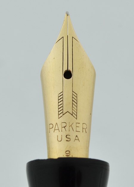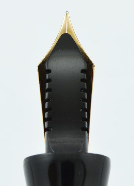Nib EXTRA FINE gold arrow style nib from the Vacumatic era, a frequently seen replacement. It's smooth and firm with nice tipping material.