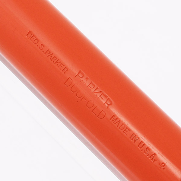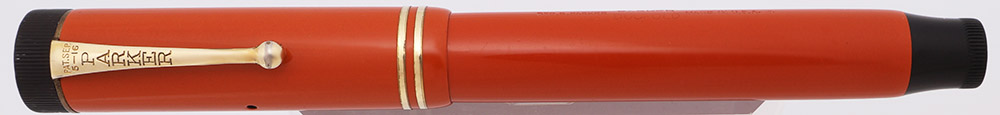 Condition Excellent condition with no cracks, chips, dents, or dings. This is an over-sized, deep red-orange pen with lots of shine and with a classic look. The cap and barrel have mainly light scratching with areas of moderate scratching. The barrel has marks caused by the cap lip. The double cap band has moderate microscratching and plating wear. The clip has plating wear on the ball end and light scratching. The cap ring has no plating remaining. The black end pieces are dark, shiny, and nice. The imprint is clear.