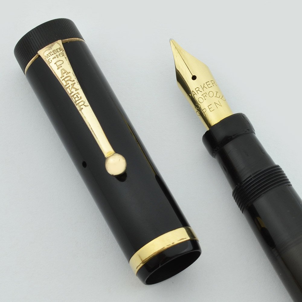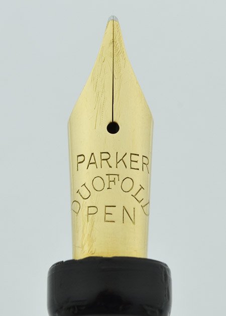 Nib Medium nib is marked "Parker Duofold Pen" -- extremely nice condition with very good tipping material. This nib is HUGE and looks great, though there are a few light scratches on the surface of the nib.