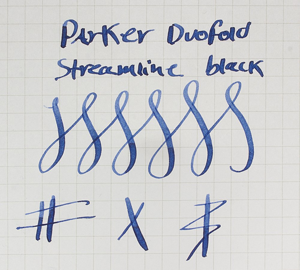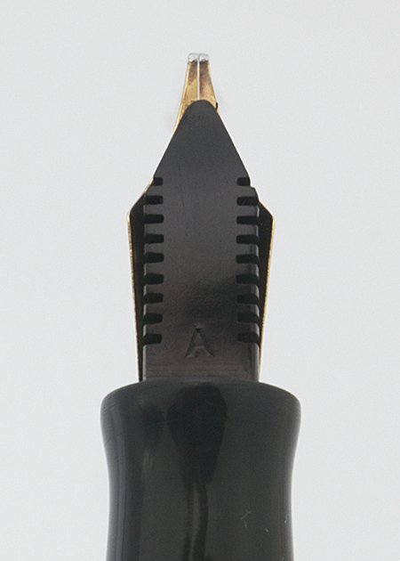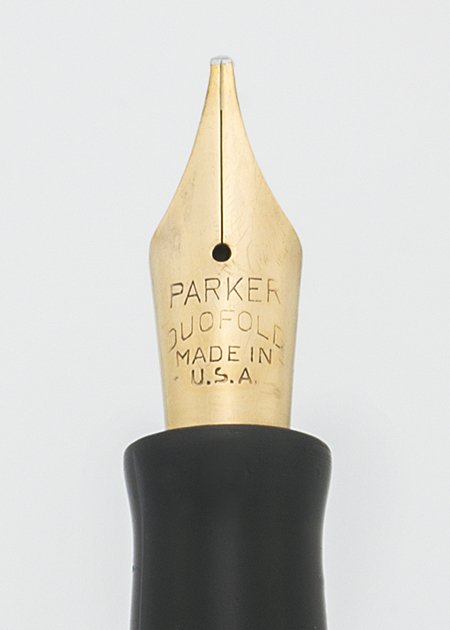 Nib STUB. Huge 14k "Parker Duofold Made in U.S.A". nib. Very smooth and nice to write with. It has a touch of flex to it and writes like a wet broad italic. Please see the writing sample below. It has an A on the feed which indicates a non-standard feed.