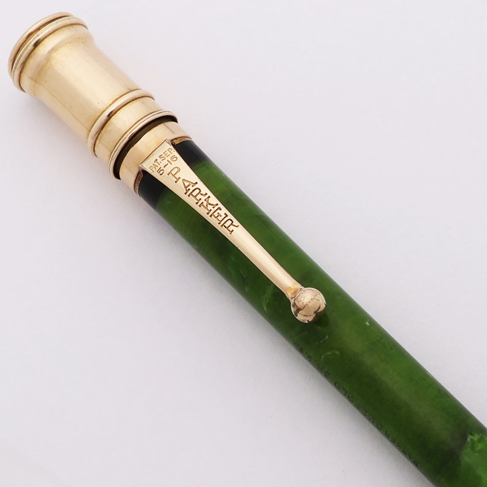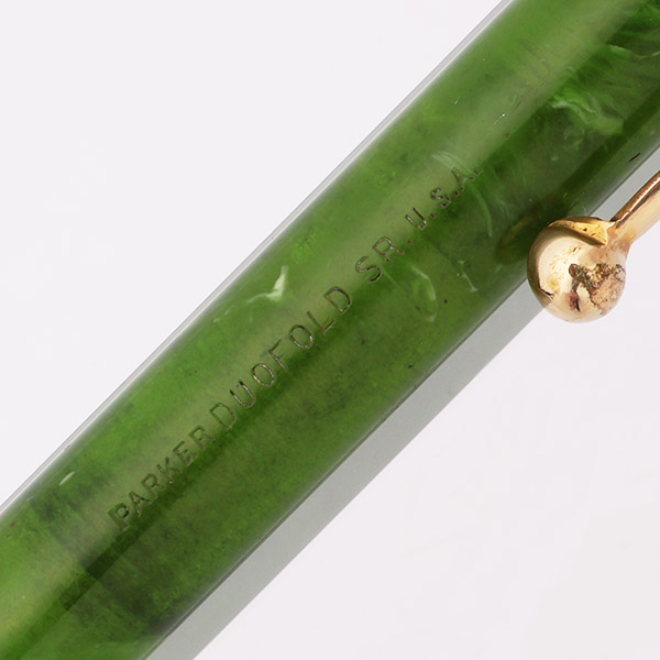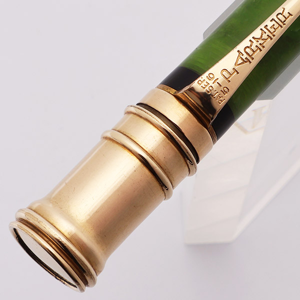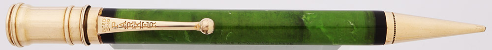 Condition Excellent condition with no cracks or chips. Minor discoloration. This is an over-sized mechanical pencil in a classic design, that is shiny and in a lovely shade of jade green. The barrel has light to moderate scratching. The cone has microscratching. The clip has plating wear on the ball end and microscratching. The top twist piece has moderate micro-scratching and one small dent. The imprints are clear.