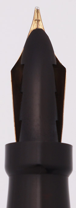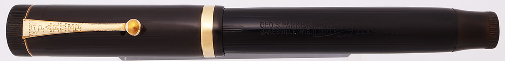 Condition Excellent condition with no cracks, chips, dents, or dings. This is a substantial pen that is shiny and dark and with a fully intact line pattern. The color is generally nice and dark black with some fading on the blind cap and just above the cap band (dark chocolate brown). The barrel has marks caused by the cap lip and by posting in addition to light scratching. The cap has a few light scratches. The cap band has moderate microscratching. The clip and clip ring have brassing with plating wear on the ball end of the clip. The imprints are crisp and clear.