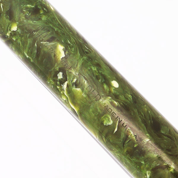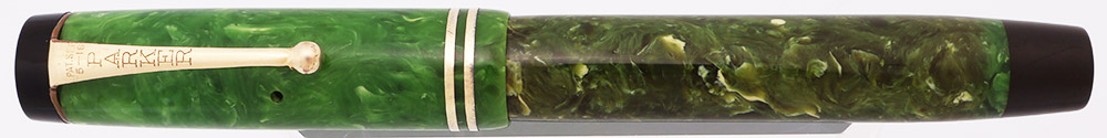 Condition Excellent condition with no cracks, chips, dents, or dings. This is a classic jade green marble pen that is very shiny. The coloration of the barrel has uniformly darkened while the cap has the original lighter shade of jade. The barrel has marks from the cap lip and light to moderate scratching. The cap has light to moderate scratching with a few small, deep scratches just under the clip ring. The cap bands have plating wear and light microscratching. The clip has plating wear on the ball end and moderate microscratching. The clip band has tarnished. The imprint is legible.