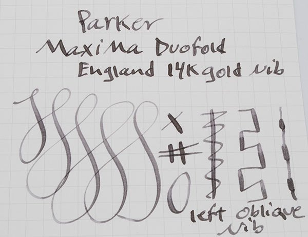 Nib Left Oblique nib. 14k with a bit of spring, but no real flex, and the line variation comes from the cut of thenib. Excellent condition, very smooth,lots of tipping material.