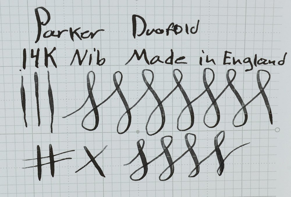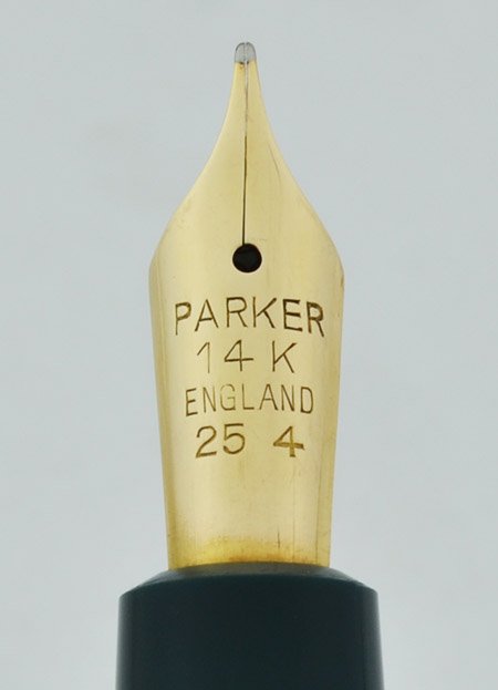 Nib MEDIUM open nib is marked Parker 14k England 25 4. It's in great condition, very smooth with excellent tipping material. It's a little less than what we would call flexible, but good every day flex that's a bit more than semi-flex. Without much pressure you can get it from a medium line to a nice large broad and even double broad. See our writing sample below.