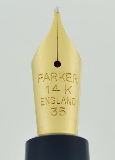 Manufacturer and Year Parker, made in England -- 1953-8 (We couldn't make out a date code on the barrel and there wasn't one on the nib, but the English Duofolds adopted aerometric systems in 1953 and the Duofold Senior was discontinued in 1958).