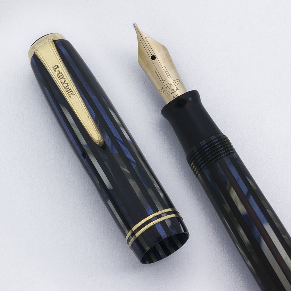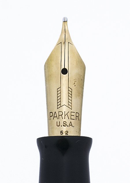 Nib MEDIUM gold Parker Pen nib is smooth with nice tipping material. It is springy and has a "52" date code on it. Based off of the fact that it's a Vacumatic nib, this is a replacement nib from 1952.