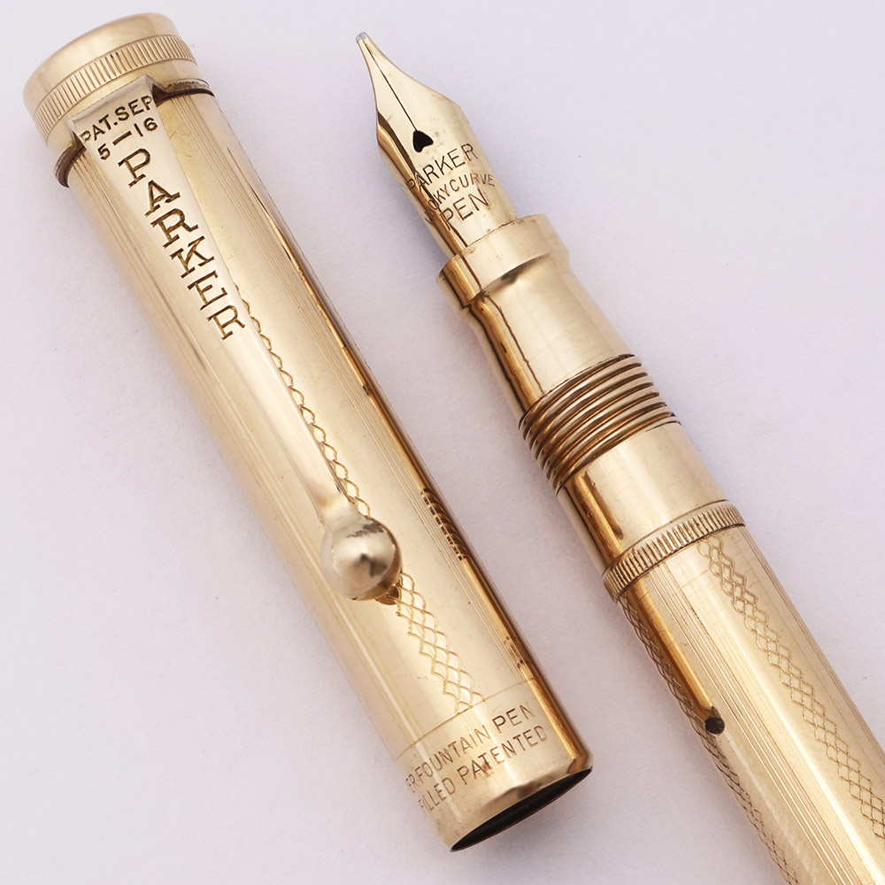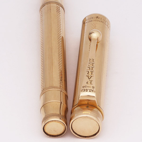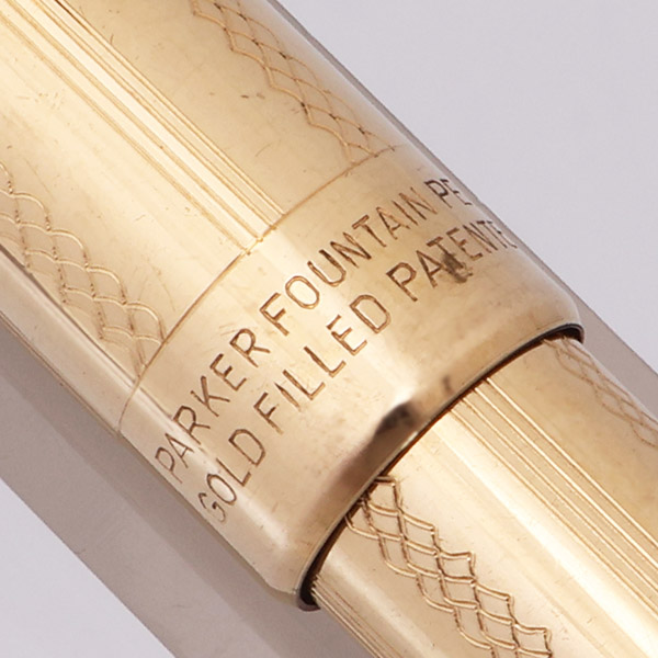 Condition Excellent + condition. There are small scratches and light marks on the gold-filled overlay throughout, but no dents or dings. The front edge of the section overlay has some spots of brassing, but the section is completely covered in metal with no lifting edges or flaking areas. The end pieces on the cap and barrel look fantastic - no brassing or plating wear, or dents or dings. There are some touches of brassing around the side of the open end of the cap; the cap lip looks fantastic with just one tiny ding. The clip and clip ring have plating wear along the sides. The ball end of the clip has some touches of brassing. This is a unique, short pen with fantastic shine from the chased gold finish. All imprints are clear.