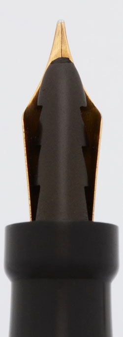 Condition Excellent condition with no cracks, chips, dents, or dings. This is a small pen in a dark, velvety black. The blind cap has faded to a chocolate brown. The barrel has marks caused by the cap lip and light to moderate scratching. There are a few small, deep marks on the blind cap. The cap has light scratching with a few small bite-like marks toward the top of the cap. The cap band has one tiny divot out of it but it is otherwise shiny and golden. The gold ring top has some brassing and plating wear and scratching on the ring itself. The imprints are clear.