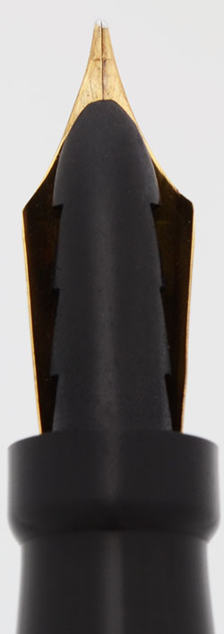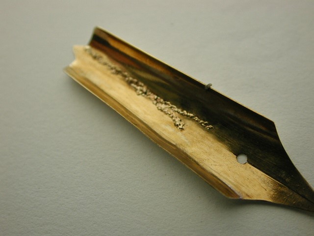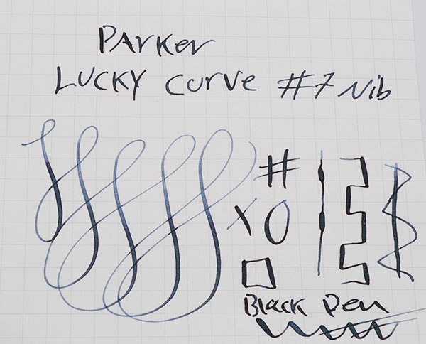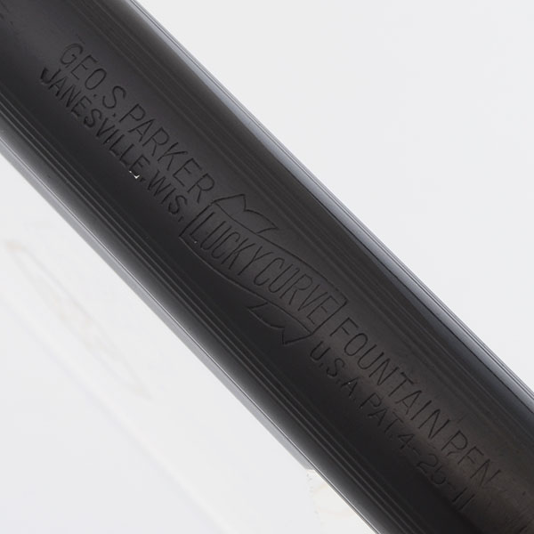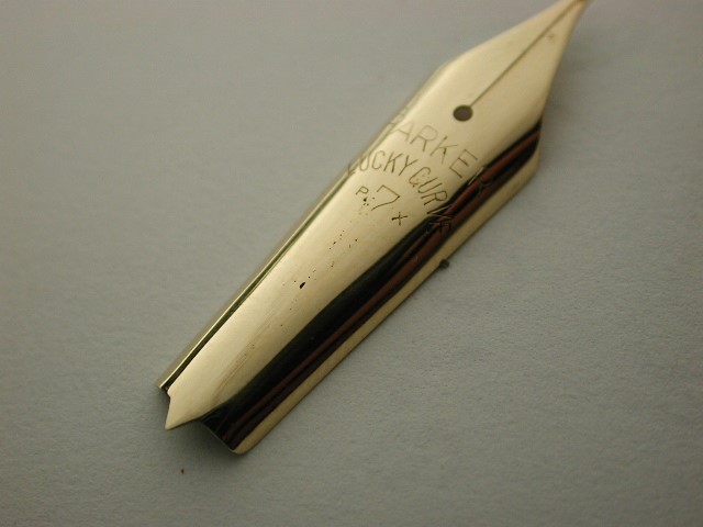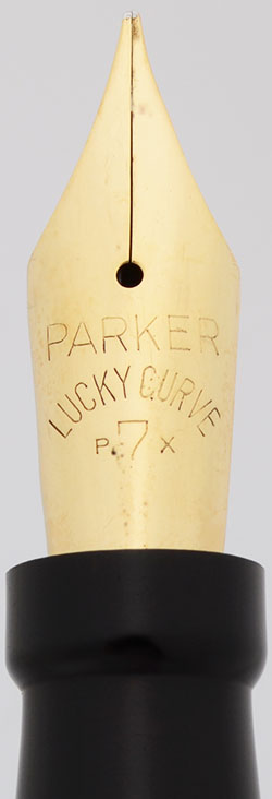 Nib FINE semi-flexible #7 Parker Lucky Curve nib. Nice line variation from fine to double-broad. See writing sample. NOTE: When we obtained this pen, the nib had a large crack in the base. This is a rare nib, so we felt it was worthwhile to have the crack repaired by Greg Minuskin, and have included two of his pictures of the welded nib for you to see.