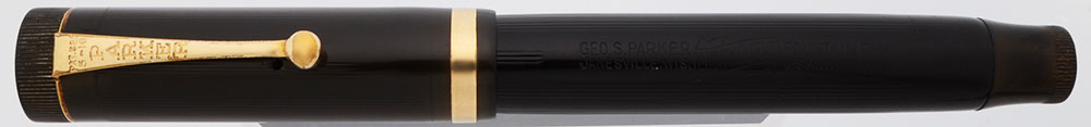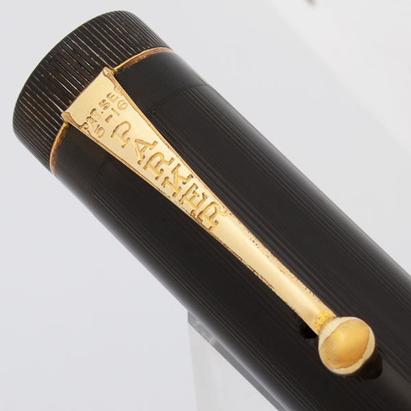 Condition Excellent + condition. The barrel is nice and dark and evenly colored. There are some horizontal marks from capping. The line pattern is strong, with some smoothing out towards the end of the barrel. The cap is slightly faded to a deep brown color, and the line pattern is smoothed out just above the band near the clip. The knurling pattern on the top is strong. The clip has plating wear and brassing on the sides and ball end. Cap band looks good, only small areas of brassing along the edges. The imprints are only a little faded by handwear. The blind cap is faded to a medium-dark brown, and has a few marks in the knurled edge. No chips or cracks. It's quite nice looking, impressively preserved, and working very well.