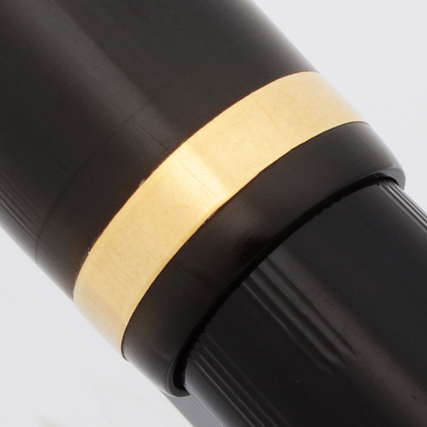 Color Black hard rubber body and cap with a grouped lines pattern. Gold plated trim. Black top and button.