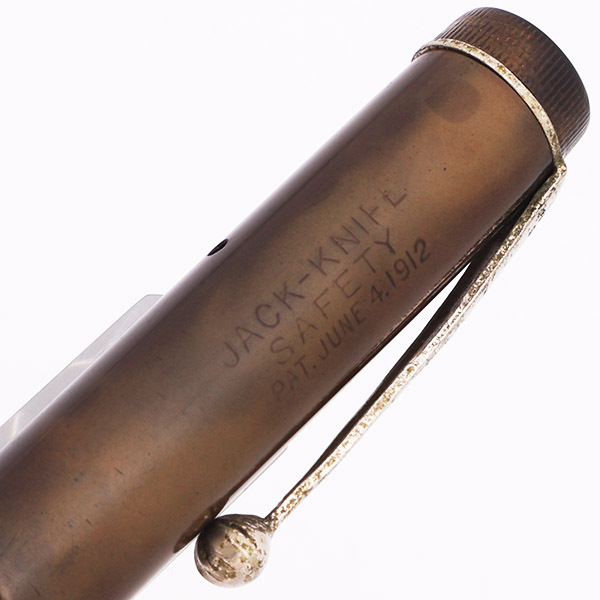Condition Excellent condition. No cracks. The color has faded quite a bit and is blotchy in spots. The cap and barrel are worn and smooth - the imprints are very smoothed down, and in some cases we really only see the shadows of them. The blind cap has some tooth marks, as does the knurled cap finial. The clip has a lot of scratching and plating wear, and some pitting. The cap imprint is readable. The barrel has some marks caused by the cap lip. The barrel imprint is very smoothed down, and only partially legible. The cap lip has some scratches, but no cracks.