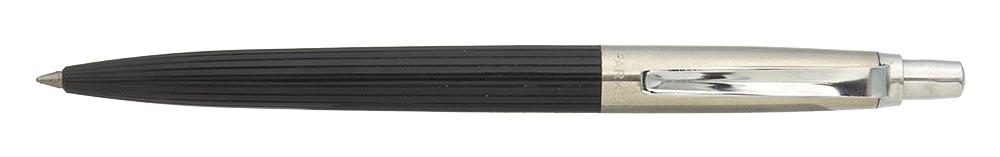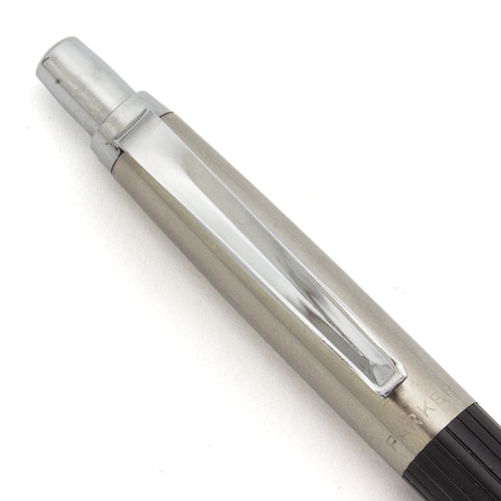 Condition Excellent condition with no cracks, chips, dents, or dings. The black ridged barrel has light scratching and surface wear. The cap is nice and shiny. It has some microscratches and four miniscule dots of pitting to the right of the clip. The trough clip has a little microscratching at the top and some very tiny dot marks of plating wear. The clicker looks perfect. The imprint is clear.