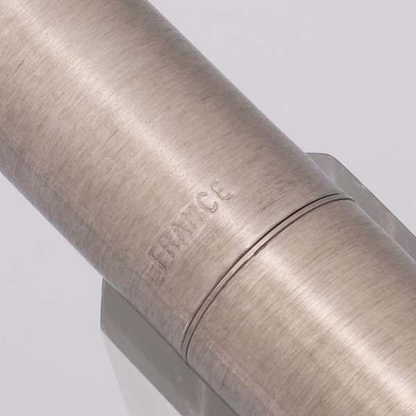Color Monochromatic brushed steel cap and barrel. We have two clip options available - shiny steel, or gold-plated. Black plastic section.