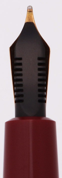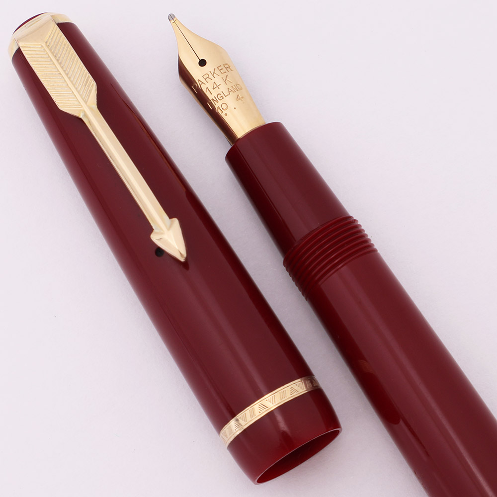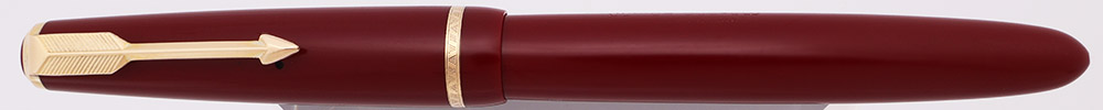 Condition Excellent + condition with no cracks, chips, dents, or dings. This is a dark red, shiny pen in a classic design. The cap and barrel have moderate scratching and microscratching. The cap band looks good with the pattern intact. The clip and clip ring are excellent. The red jewel is excellent. The imprints are clear.
